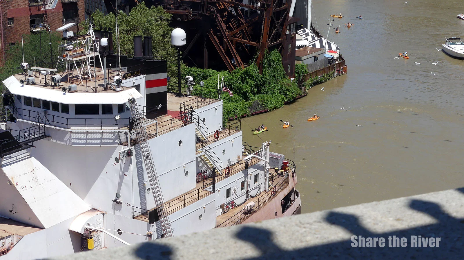 A birds-eye view of recreational kayaks interacting with the freighter Sam Laud as it transited the lower Cuyahoga River (more on that in a future post).